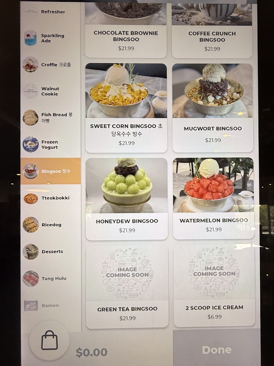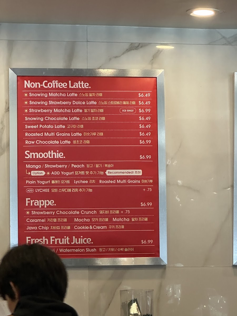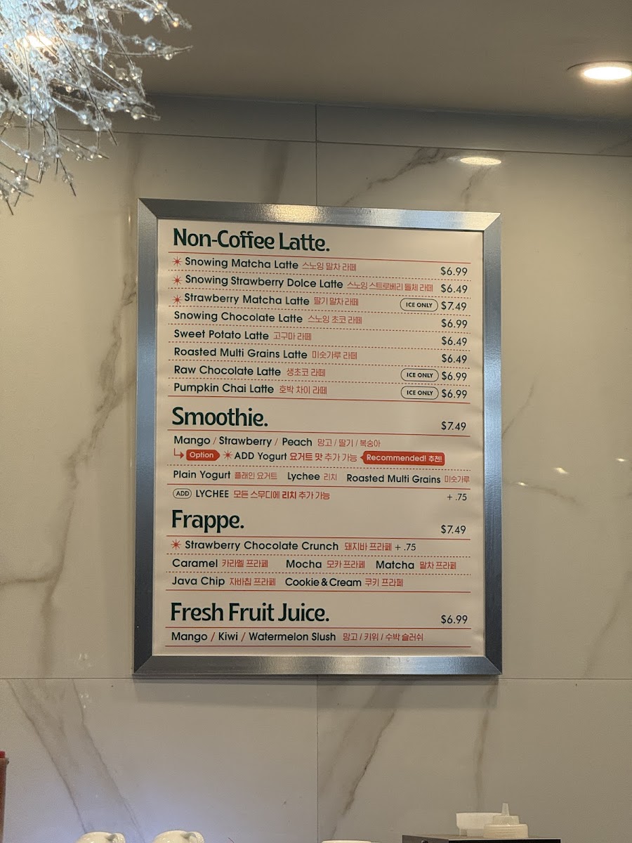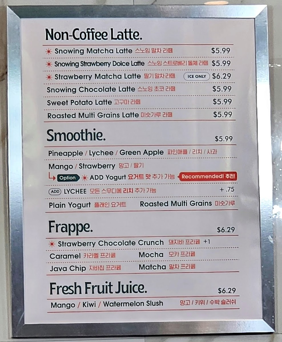 You’ll find a variety of coffee creations like cappuccinos, mocha lattes, and Korean iced coffee, alongside specialty options such as the Brownie Latte or Irish Cream Coffee. For those looking for lighter refreshments, vibrant smoothies and slushes like the Strawberry Smoothie and Watermelon Slush offer a fresh, uplifting choice.